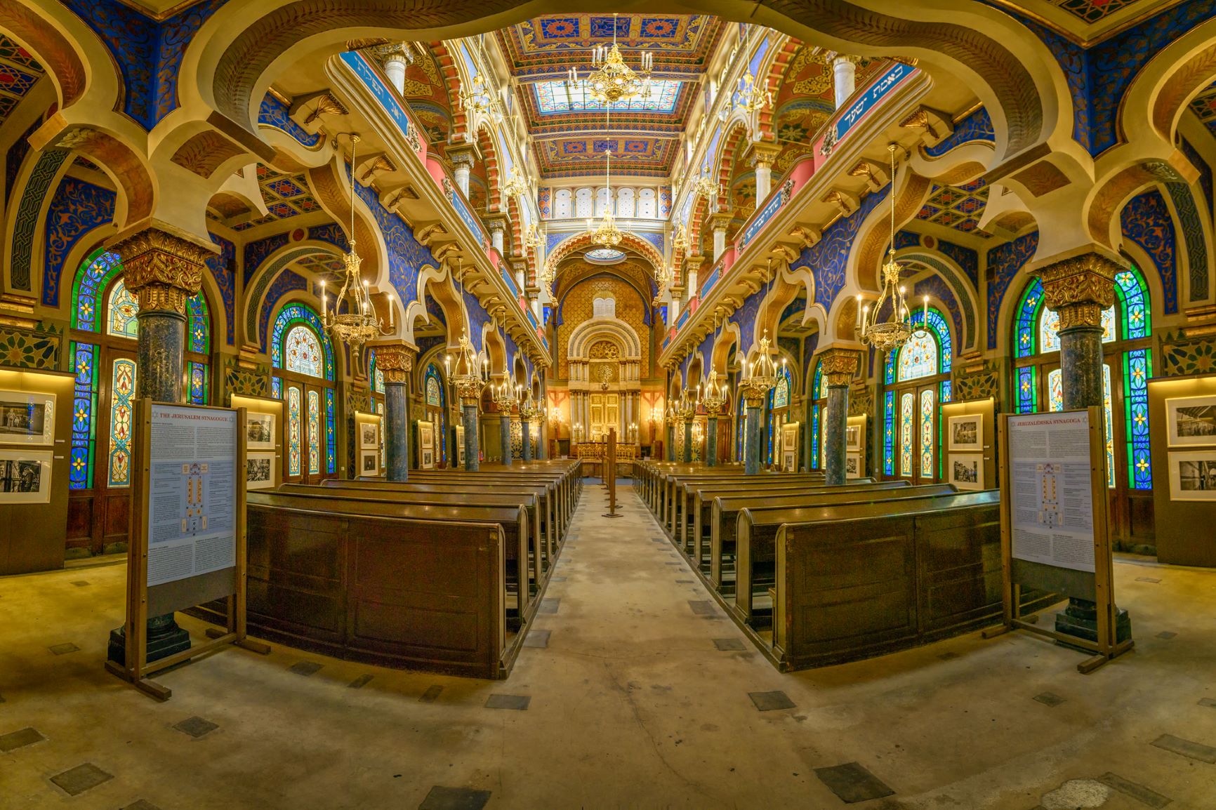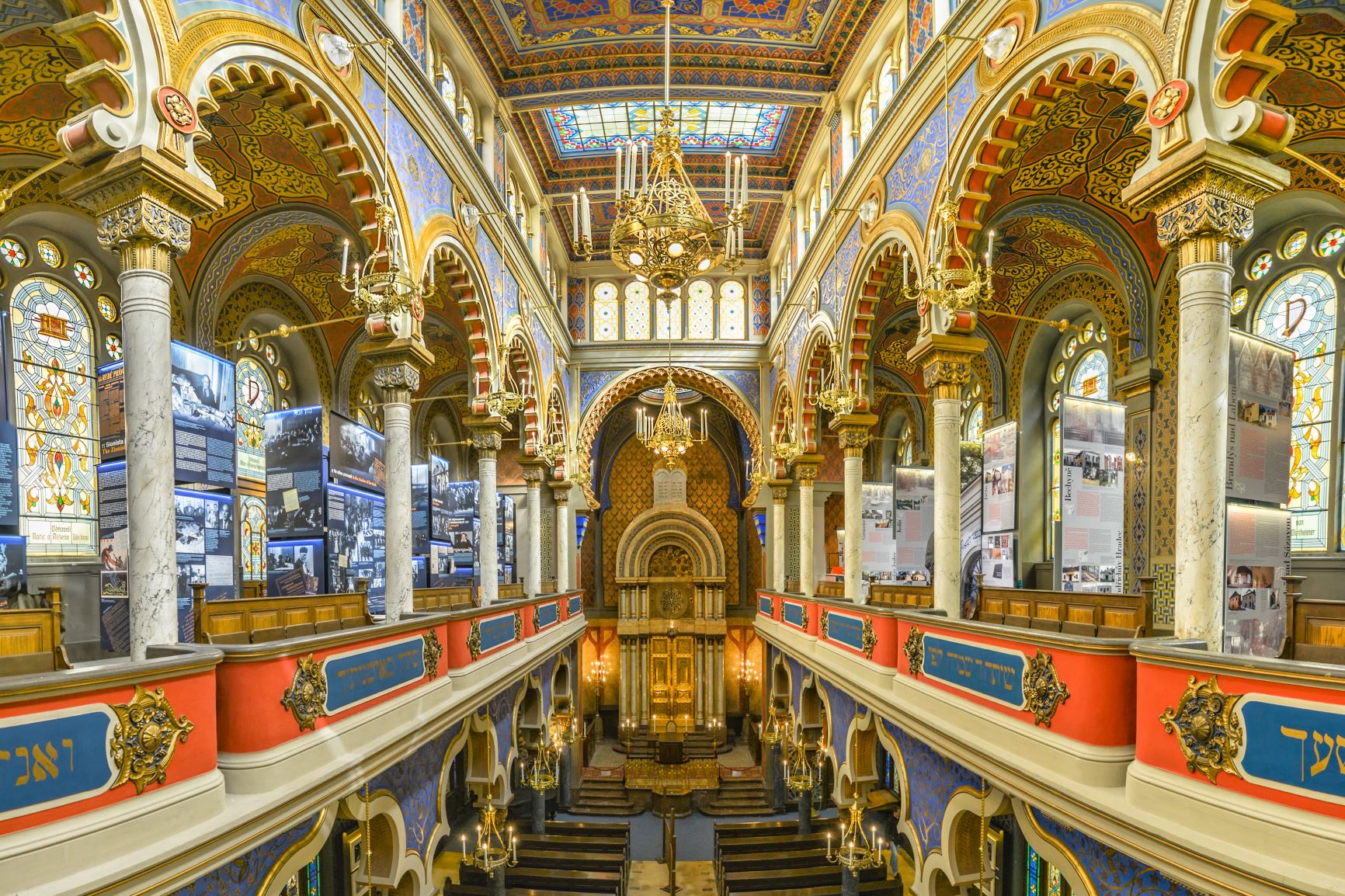 Туристы называют это место одним из прекраснейших зданий в чешской столице. Такое почетное звание сооружение получило благодаря оригинальному исполнению в стиле сецессии с применением элементов мавританской стилизации. Синагога стоит на узкой улочке посреди обыкновенных домов, привлекая издали своим великолепным фасадом. Он декорирован богатым орнаментом золотистого и синего цвета, множеством шестиконечных звезд. Над главным проходом виднеется большое витражное окно. Вход украшен арочным проемом и огражден массивными колоннами.Внутреннее убранство поражает взгляд не меньше наружного. Сложнейшая роспись, узоры, шикарные кованые люстры, хранящий свиток ковчег, большой орган, помещенный в прекрасную декорированную нишу, делают здание уникальным историко-архитектурным памятником. Синагога доступна для посещения туристами любого вероисповедания.