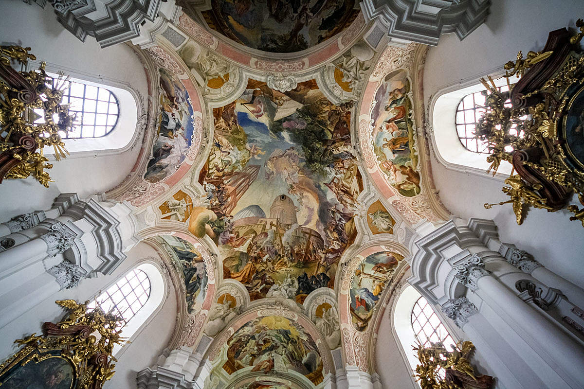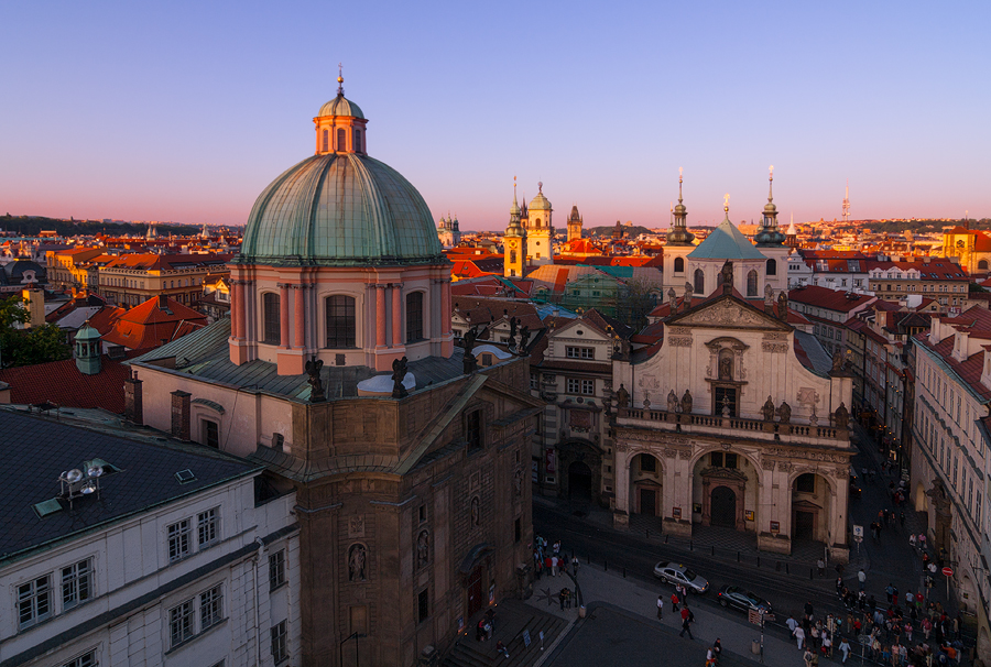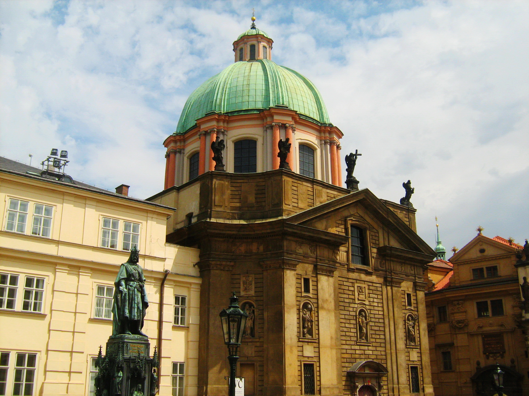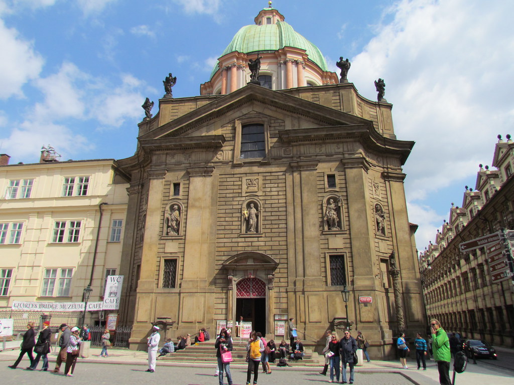 Неповторимым обликом обладает церковь Франциска Ассизского на площади Крестоносцев, выстроенная в форме равностороннего креста, символизирующего Мальтийский орден. На фасаде размещено пять статуй святых, созданных известными скульпторами. Панораму Праги здорово обогащает оформленный в итальянских традициях великолепный купол храма. По его основанию оборудованы высокие окна, которые пропускают свет вовнутрь здания.Комплекс состоит из двух часовен, входной зоны прямоугольной формы, алтарной части. Все площадки украшены картинами, фресками, росписями, изображениями и статуями святых, лепниной, резными скамьями. Интерьер полностью соответствует вычурному и пышному стилю барокко.