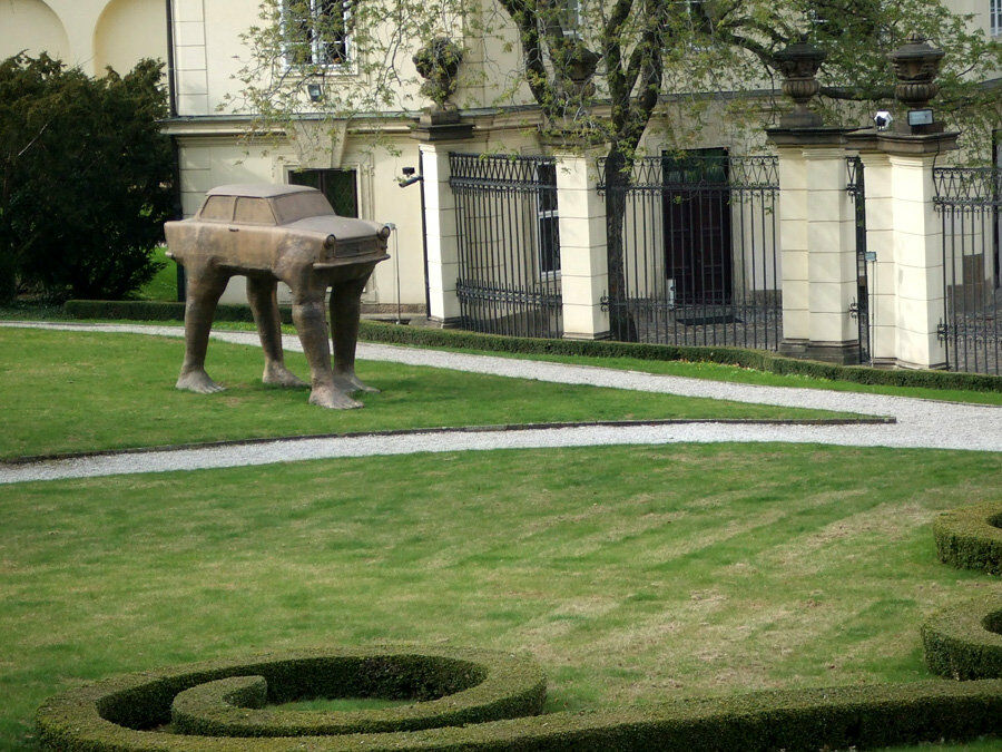На площадке около немецкого посольства в Праге куда-то торопится «трабант» с человеческими ногами. Композиция связана с тяжелой историей беженцев бывшей ГДР, которые массово искали пристанища в чешской столице до падения Берлинской стены. Тогда люди бросали машины и спешили просить о политическом убежище. Именно эти времена символизирует причудливый памятник автомобиля.
