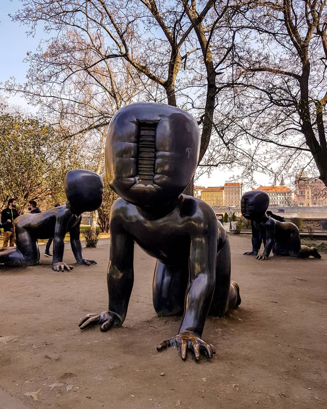 Стены знаменитой Жижковской телебашни открывают взгляду еще одно неординарное зрелище – гигантских ползающих младенцев. Идея создания провокационных скульптур принадлежит скандально известному Давиду Черному. Через их обезличенность автор выразил своеобразный протест против абортов. Многие считают это творение одним из самых жутких произведений в мире. Особенно ужасающе экспозиция выглядит в темное время суток. Познакомиться с огромными чернокожими малышами можно и на территории парка Кампа. Там обитают несколько отлитых из бронзы собратьев жижковских героев.