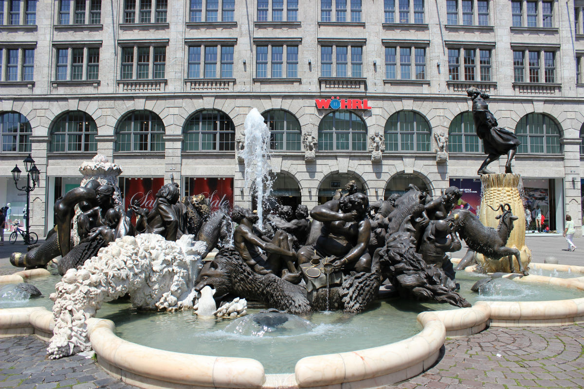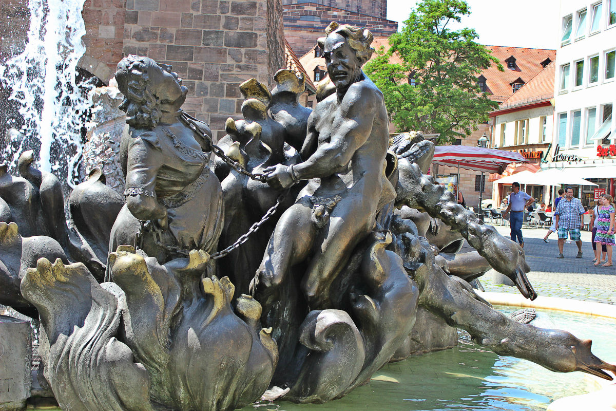 Фонтан с необычным названием «Карусель брака» – весьма оригинальное сооружение конца 20 века, расположенное на площади Ludwig Platz. По задумке его автора Ю. Вебера в скульптурной композиции воплощены темные и светлые, горькие и сладкие стороны супружеской жизни. Создание подобного ансамбля было навеяно мотивами стихотворения Х. Загса, в котором описаны все стадии существования семейной пары, начиная порывами первой страсти.Круговорот брачной карусели в фонтане изображен с помощью групп скульптур, символизирующих нежную любовь молодых супругов, вечные ссоры зрелых мужа и жены. Также здесь можно увидеть семейную идиллию с символом материнской любви, изнеможённые скелеты женщины и мужчины, которые продолжают душить друг друга после смерти, и еще несколько скульптурных композиций, подталкивающих к тому, чтобы задуматься и переосмыслить семейные ценности.Появление этого фонтана спровоцировало много споров по поводу уровня пристойности отдельных скульптур и целесообразности их размещения в общественном месте. Тем не менее, сооружение стало популярной среди туристов достопримечательностью в Нюрнберге.Традиционные колоритные домики, величественные готические храмы, средневековые мосты и прекрасные замки делают Нюрнберг особенным и неповторимым. Этот город умеренно яркий, не слишком броский и очень уютный. Он запоминается бушующей зеленью, красивыми отражениями, разноцветными крышами. Для полноценного знакомства с ним мало даже нескольких дней, поэтому многие туристы, очарованные его обаянием, через время возвращаются снова.