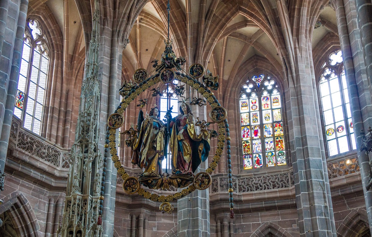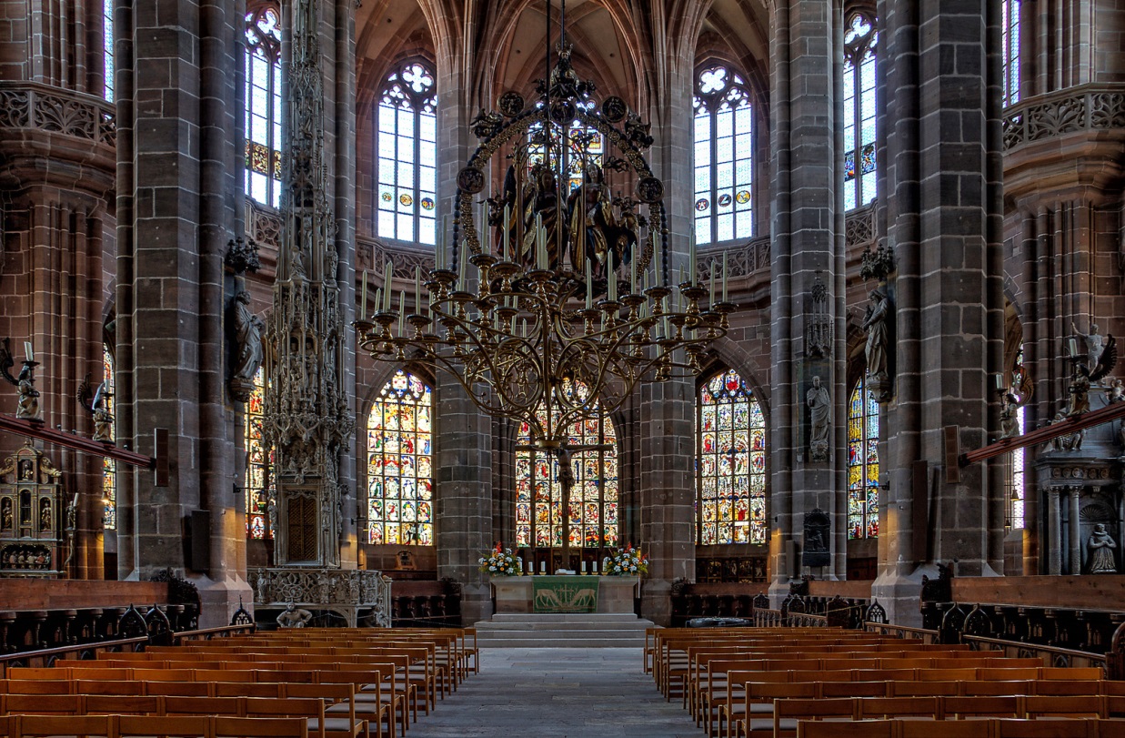 Как известно, Нюрнберг славится своими готическими храмами. В этом городе их достаточно много, и они действительно поражают взгляд. Среди всех подобных сооружений особенно выделяется возведенная в 13 веке Церковь Святого Себальда. Старейший приходской храм носит имя отшельника и покровителя, который всегда помогал нуждающимся, лечил бедных. Его мощи хранятся в серебряном реликварие, установленном по центру здания.Внутреннее убранство и архитектура содержат элементы романского, раннего и позднеготического стиля, эпохи барокко. Собор украшен готическим алтарем, барельефами, колоннами, витражами. Здесь сохранились уникальные произведения искусства – скульптура Мадонны в венке лучей, автором которой является Петер Фишер, а также надгробный памятник Себальду, декорированный скульптурными ансамблями, отображающими жизнь святого.В качестве пары древнему готическому собору была построена Церковь Св. Лоренца. Ее возвели в 13 веке на месте романской базилики. Фасад здания украшен изящной тонкой резьбой. Между двумя башнями, выполненными в стиле ранней готики, расположено красивое витражное окно с ажурной розеткой диаметром около 9 метров.Внутренняя часть храма насыщена богатым убранством, атмосферой средневекового колорита, многочисленными произведениями искусства, стоящими внимания туристов. Бывалые путешественники советуют не пропустить великолепные витражи, дарохранительницу, золоченый канделябр, скульптурную композицию Штосса «Благовещение», размещенные в хоре церкви.Собор Св. Лоренца – место пребывания одного из самых больших в Германии органов. Его превосходное звучание можно услышать во время службы или регулярно проходящих концертов духовной музыки.